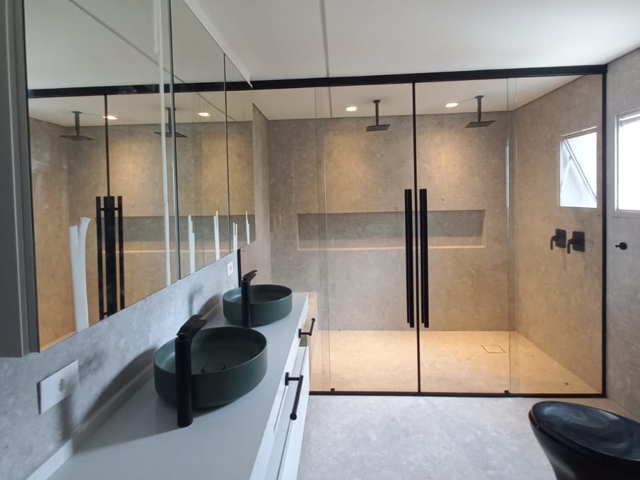 O vidro indicado para box é o vidro temperado, pois é um vidro de segurança, aconselha-se a aplicação de película. Trabalhamos com todas as cores e espessuras.